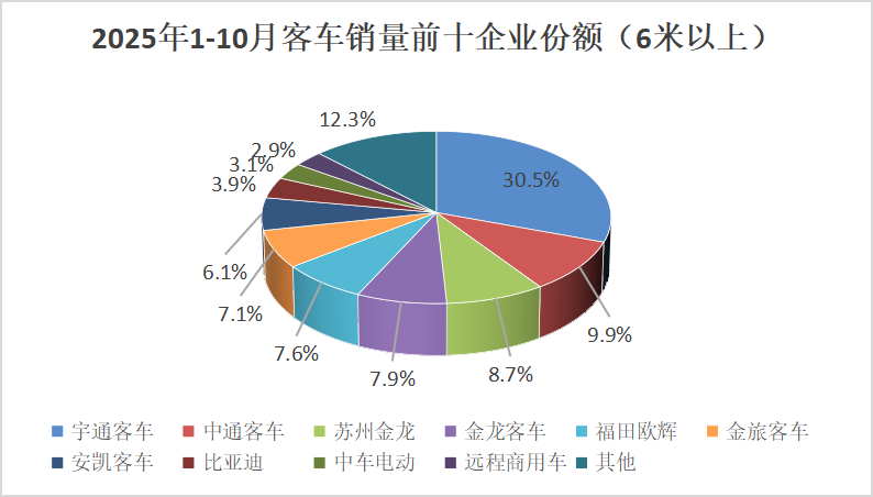 从市场份额来看,2025年1-10月前十企业占据了87.7%的市场份额,前五企业市场份额为64.6%,后五企业为23.1%。前十企业中,有三家企业市场份额占据较高,其中,宇通客车以30.5%的市场份额,继续稳坐王座;中通客车、苏州金龙两家企业分别占据9.9%、8.7%的市场份额。