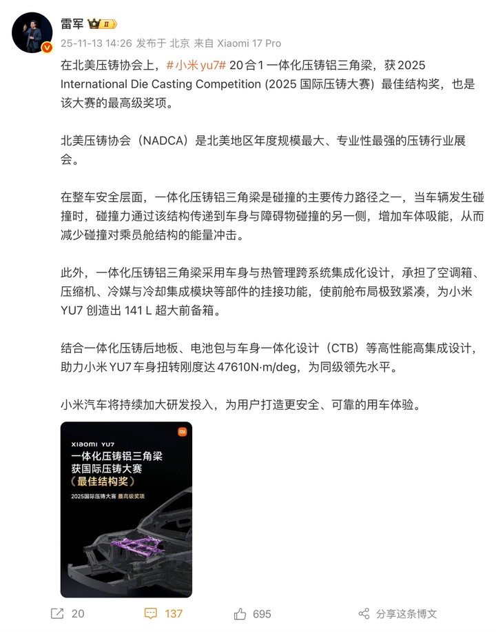 雷军回应小米汽车获 2025 国际压铸大赛「最佳结构奖」