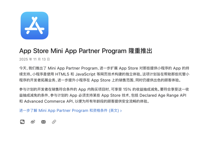 今日凌晨,苹果正式宣布「Mini Apps 合作伙伴计划」,标志着小程序首次进入 iOS 体系,成为制度化的合规应用形态。该计划为开发者提供新的商业化路径,并将小程序纳入苹果监管框架。