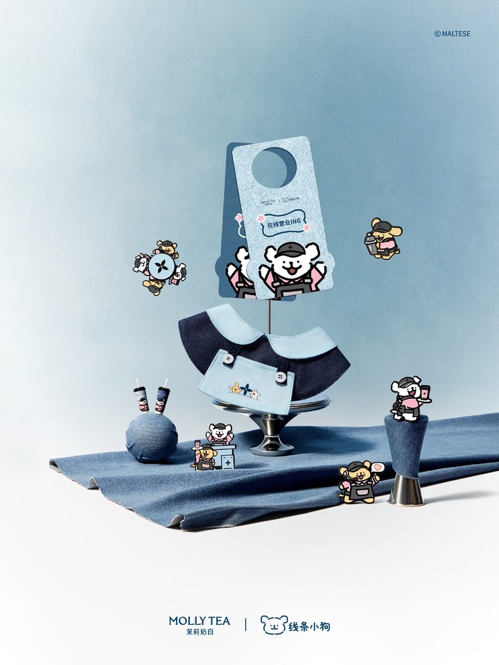 此次合作涵盖限定饮品研发、主题门店打造、周边产品上线及公益行动。线条小狗在此次合作中被赋予「摩登茶铺主理人」身份,解锁调茶师、店长、店员等多重角色,强化品牌叙事。